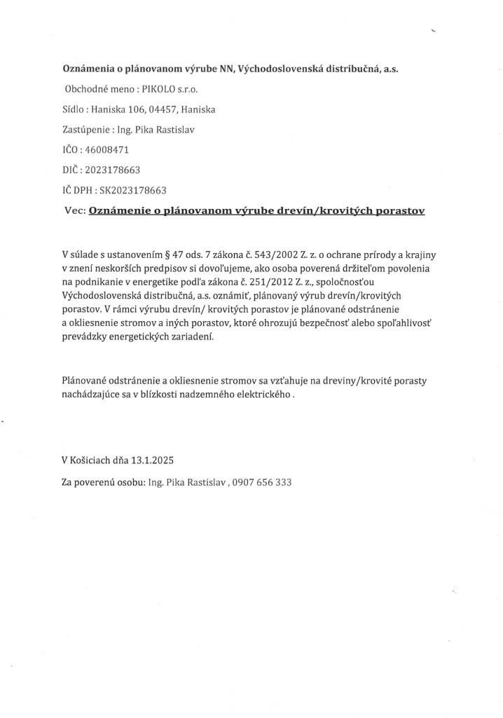 V súlade s ustanovením § 47 ods. 7 zákona č. 543/2002 Z. z. o ochrane prírody a krajiny v znení neskorších predpisov si dovoľujeme, ako osoba poverená držiteľom povolenia na podnikanie v energetike podľa zákona č. 251/2012 Z. z., spoločnosťou Východoslovenská distribučná, a.s. oznámiť, plánovaný výrub drevín/krovitých porastov. V rámci výrubu drevín/ krovitých porastov je plánované odstránenie a okliesnenie stromov a iných porastov, ktoré ohrozujú bezpečnosť alebo spoľahlivosť prevádzky energetických zariadení.